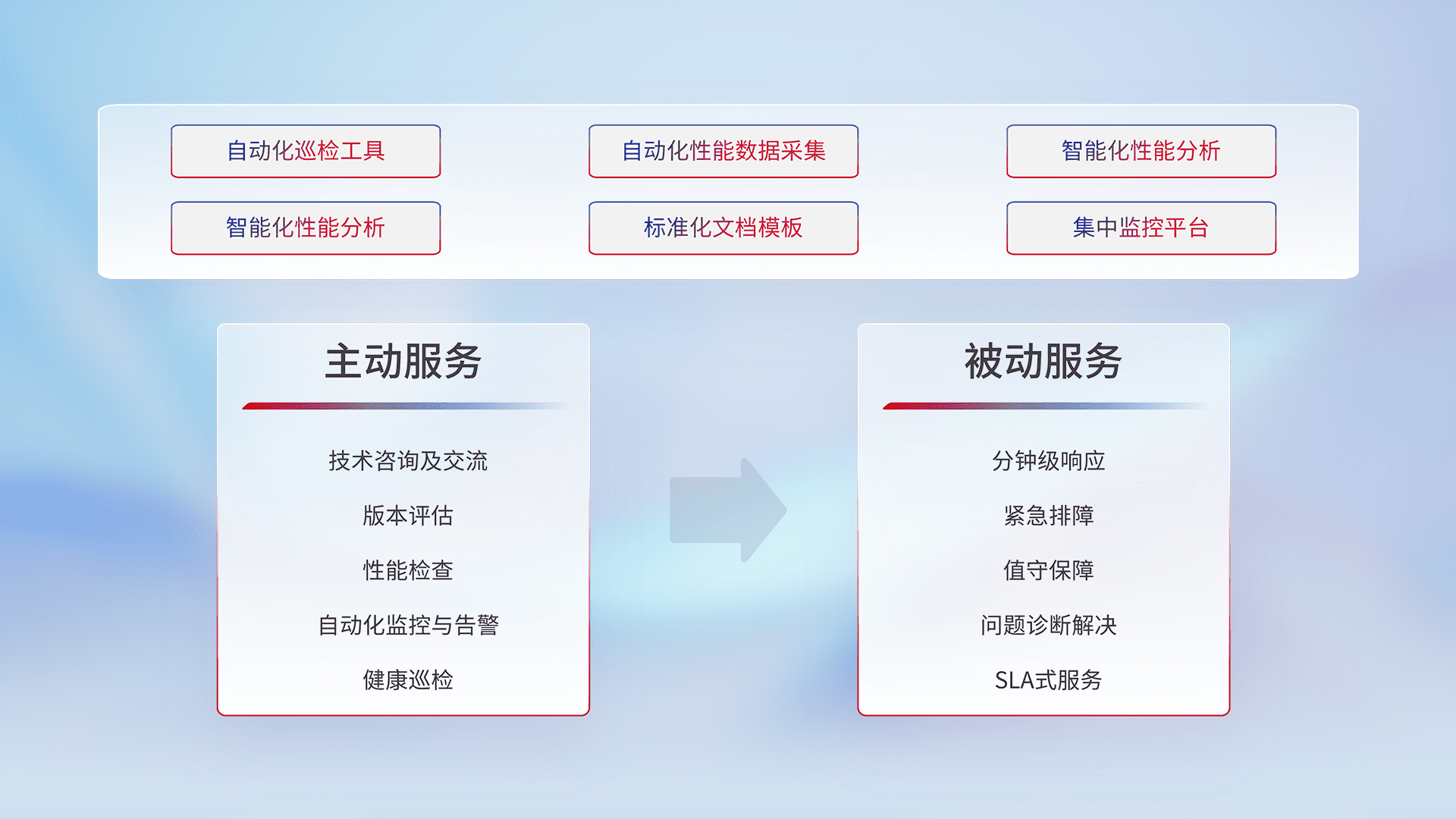 智能化工具和标准化文档,,保障服务质量,,提供主动服务(包含技术咨询、、、、版本评估、、、性能检查、、、、自动化监控与告警、、、健康巡检)和被动服务包含(分钟级响应、、、、紧急排障、、、值守保障、、、问题诊断解决、、、SLA服务)。。